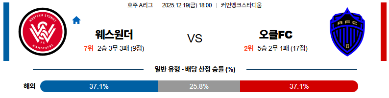 12월19일 웨스턴시드니:오클랜드FC 호주A리그 분석 및 예측