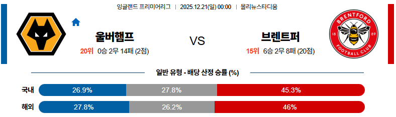 12월21일 울버햄튼:브렌트퍼드 프리미어리그 분석 및 예측