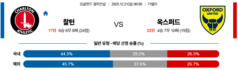 12월21일 찰튼:옥스포드 잉글랜드챔피언쉽 분석 및 예측