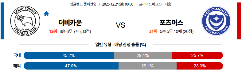 12월21일 더비카운티:포츠머스 잉글랜드챔피언쉽 분석 및 예측