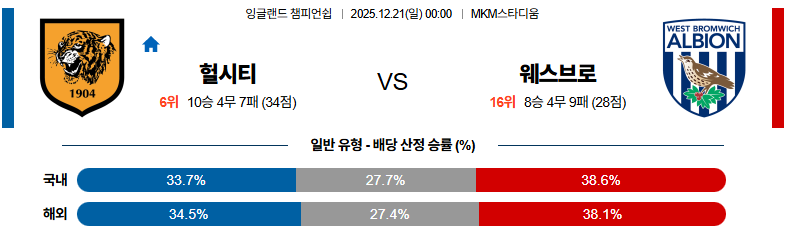 12월21일 헐시티:웨스트브로미치 잉글랜드챔피언쉽 분석 및 예측