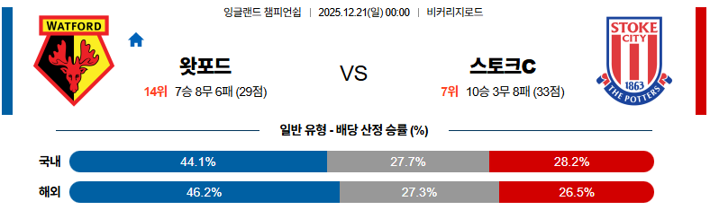 12월21일 왓포드:스토크시티 잉글랜드챔피언쉽 분석 및 예측