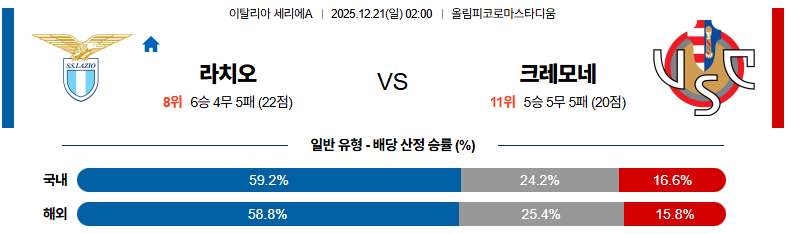 12월21일 라치오:크레모네세 세리에A 분석 및 예측