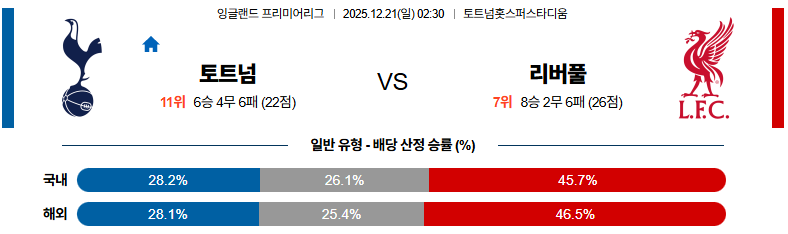 12월21일 토트넘:리버풀 프리미어리그 분석 및 예측