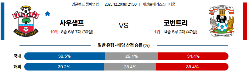 12월20일 사우샘프턴:코번트리 잉글랜드챔피언쉽 분석 및 예측