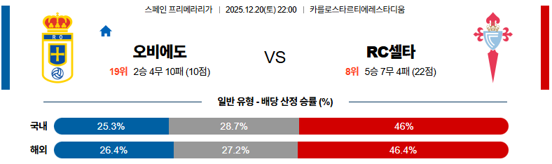12월20일 오비에도:셀타비고 라리가 분석 및 예측