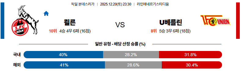 12월20일 쾰른:우니온베를린 분데스리가 분석 및 예측