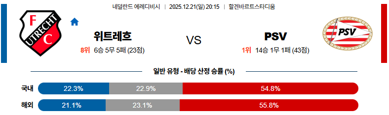 12월21일 위트레흐트:아인트호벤 에레디비지 분석 및 예측