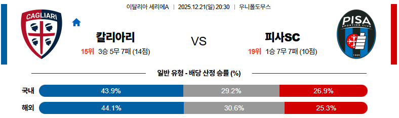 12월21일 칼리아리칼초:피사 세리에A 분석 및 예측