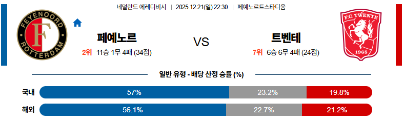 12월21일 페예노르트:트벤테 에레디비지 분석 및 예측