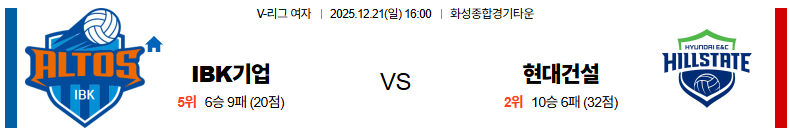 12월21일 IBK기업은행:현대건설 V리그(여) 분석 및 예측