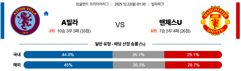 12월22일 아스톤빌라:맨유 프리미어리그 분석 및 예측