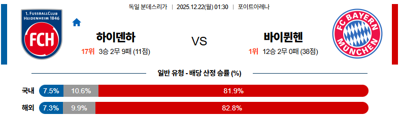 12월22일 하이덴하임:바이에른뮌헨 분데스리가 분석 및 예측