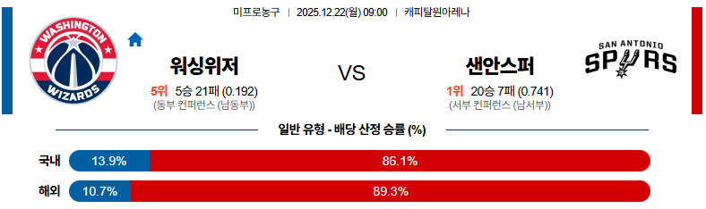 12월22일 워싱턴:샌안토니오 NBA 분석 및 예측