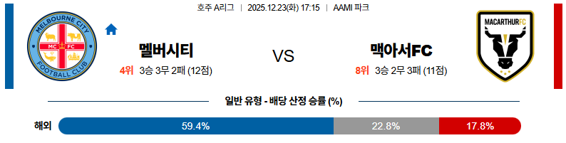 12월23일 멜버른시티:맥아서FC 호주A리그 분석 및 예측