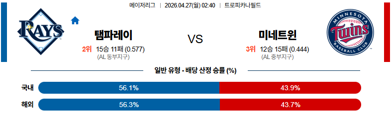 04월27일 탬파베이:미네소타 MLB 분석 및 예측