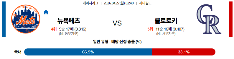 04월27일 뉴욕메츠:콜로라도 MLB 분석 및 예측