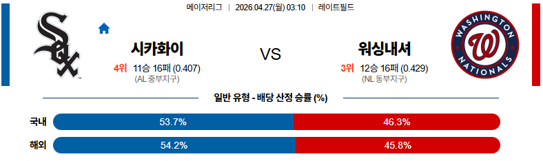 04월27일 시카고W:워싱턴 MLB 분석 및 예측