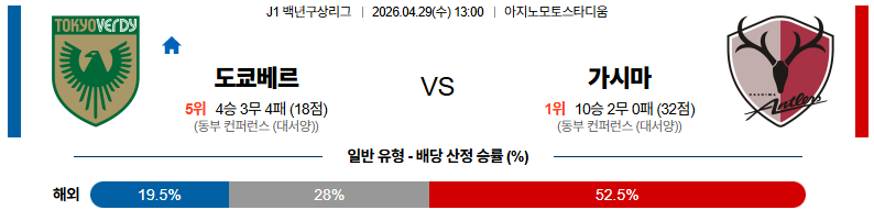 04월29일 도쿄베르디:가시마 J리그백년구상리그 분석 및 예측