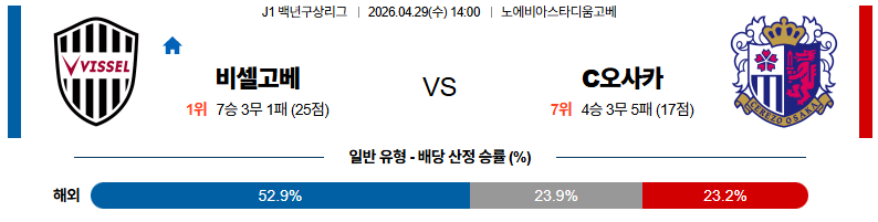 04월29일 비셀고베:세레소오사카 J리그백년구상리그 분석 및 예측
