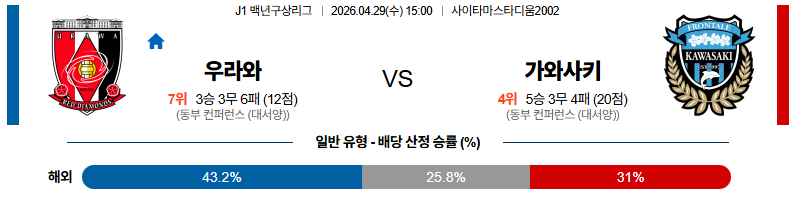 04월29일 우라와:가와사키 J리그백년구상리그 분석 및 예측