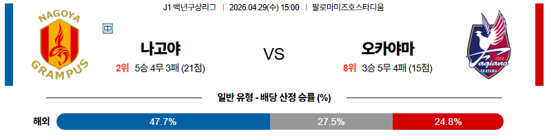 04월29일 나고야:오카야마 J리그백년구상리그 분석 및 예측