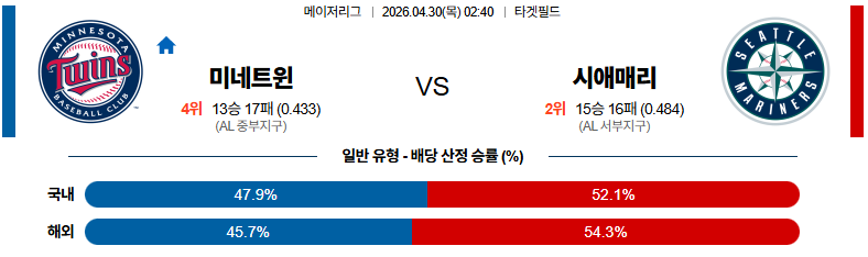 04월30일 미네소타:시애틀 MLB 분석 및 예측