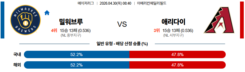 04월30일 밀워키:애리조나 MLB 분석 및 예측