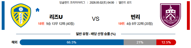 05월02일 리즈:번리 프리미어리그 분석 및 예측