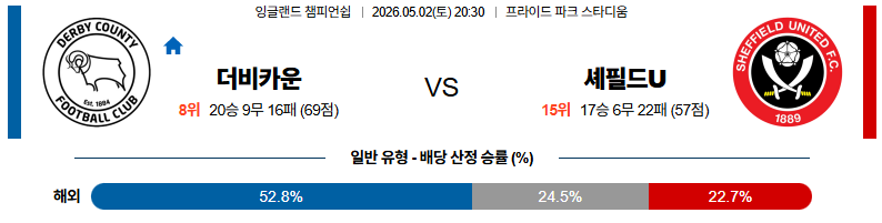 05월02일 더비카운티:셰필드유나이티드 잉글랜드챔피언쉽 분석 및 예측