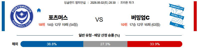 05월02일 포츠머스:버밍엄시티 잉글랜드챔피언쉽 분석 및 예측