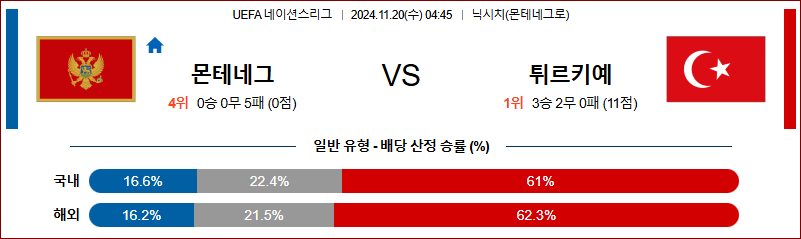 11월 20일 04:45 UEFA 네이션스리그 몬테네그로 튀르키예