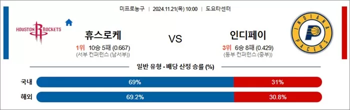 • 핵심 변수: 휴스턴의 빠른 전개와 인디애나의 조직력 있는 수비와 공격이 맞붙는 경기입니다. 휴스턴의 젊은 선수들이 얼마나 효율적인 공격을 펼칠 수 있을지가 중요한 요소입니다.