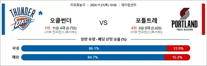 • 핵심 변수: 오클라호마 시티의 빠른 공격과 수비에서의 조직력 대 포틀랜드의 공격적인 전개와 외곽 슈팅이 맞붙는 경기입니다. 오클라호마 시티가 포틀랜드의 약한 수비를 공략할 수 있을지, 포틀랜드는 외곽에서 득점할 기회를 만들 수 있을지가 중요한 변수입니다.
