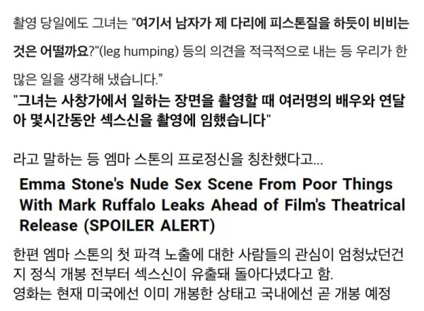 엠마 스톤이 노출 연기에 부담이 없어진 이유 초코초코 초코초코님의 홈 초코초코님의 홈 2025-11-22 13:16 206 0 0 목록 본문 <가여운 것들> 미국 개봉 전에 진행된 인터뷰라 해당 인터뷰에서 말하는 영화는 <가여운 것들>임. 0 로그인 후 추천하실 수 있습니다. 초코초코 초코초코님의 홈 초코초코님의 홈 회원등급 : 골드 / Level 39 포인트 834,472 경험치 574,600 [레벨 39] - 진행률 65% 가입일 2024-02-26 11:39:00 서명 미입력 자기소개 치키치키 글쓴이의 최신글 글쓴이의 최신댓글 [자유게시판] 주말 PC방 게임순위 2026-01-18 [후방게시판] 이정도면 유부녀도 괜찮아 2025-11-10 [자유게시판] 아 피목였구나 2025-11-06 [자유게시판] 롯데 데이비슨 시즌 몇호 소환 인가요? 2025-09-13 [후기게시판] 씨유벳 600배 후기 2025-09-12 [자유게시판] 넷플 야망의 함정 화질 죽이네요 2025-09-01 [자유게시판] 불고기버거 2025-08-10 [자유게시판] 아오....이놈에 눈이 문제지... 2025-08-03 [자유게시판] 뻐금뻐끔 푸하아~~~담배 좋지요 2026-01-04 [자유게시판] 웃을일이 아닌듯... 2025-12-14 [자유게시판] 메모했습니다 2025-11-21 [자유게시판] 그러네요 2025-10-29 [자유게시판] 피디는 남자 2025-10-29 [자유게시판] 저는 뜨거운 물에 발씻기가 도움되더라구요 2025-10-16 [자유게시판] ㅋㅋㅋㅋㅋㅋㅋ웃기네 2025-10-10 [자유게시판] 맛드요 2025-10-09 댓글목록0 등록된 댓글이 없습니다.