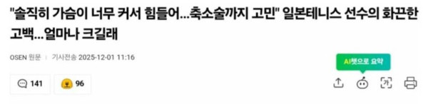 가슴이 커서 축소수술 고민이라는 테니스 선수