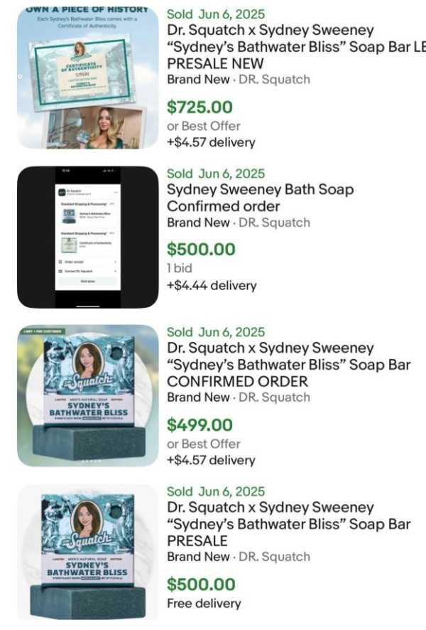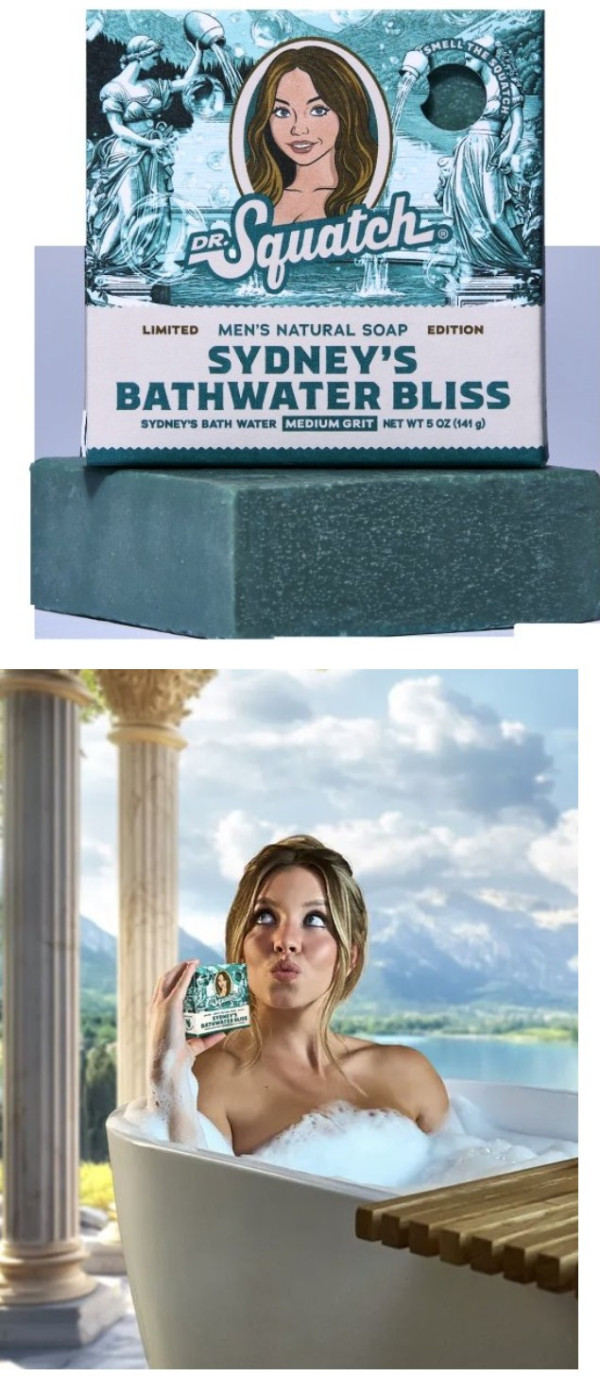 시드니 스위니가 미국의 천연비누 제조 회사인 Dr. Squatch와 콜라보 해서 출시한 "목욕물 비누"(실제 시드니 스위니가 목욕한 물을 소량 첨가했다 함ㄷㄷㄷㄷ)