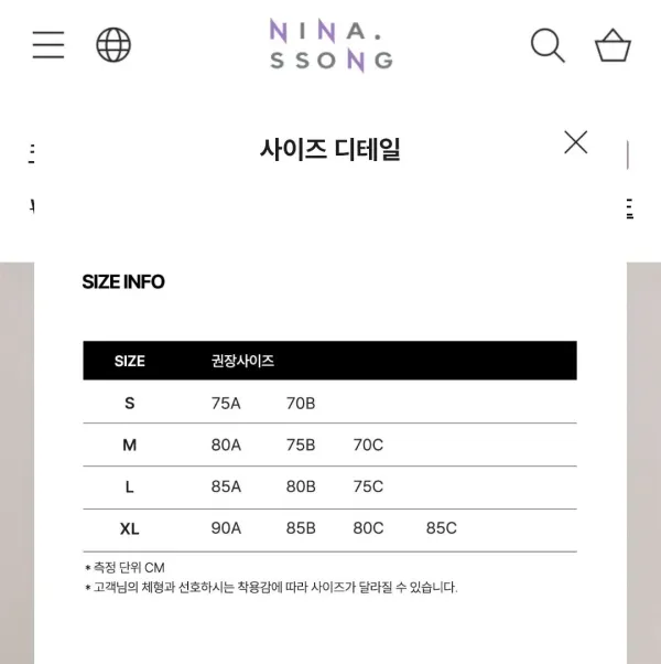 비비안 보면 75a부터 시작인거 볼 수 있고 니나쏭이란곳도 역시 사이즈표가 75a부터인거 볼 수 있음