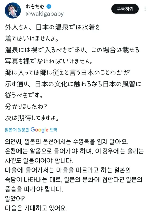 온천에 엄격한 일본 트위터 유저 초코초코 초코초코님의 홈 초코초코님의 홈 2026-03-07 20:39 36 0 0 목록 본문 온천욕을 하는 사진을 올린 우크라이나 누나 (음주 목욕은 위험하니 하지말자) 그리고 온천욕에 서투른 외국인에게 일본의 풍습을 알려주는 일본 트위터 유저 0 로그인 후 추천하실 수 있습니다. 초코초코 초코초코님의 홈 초코초코님의 홈 회원등급 : 골드 / Level 41 포인트 663,399 경험치 638,950 [레벨 41] - 진행률 78% 가입일 2024-02-26 11:39:00 서명 미입력 자기소개 치키치키 글쓴이의 최신글 글쓴이의 최신댓글 [자유게시판] 스트레칭 2026-02-28 [자유게시판] 주말 PC방 게임순위 2026-01-18 [후방게시판] 이정도면 유부녀도 괜찮아 2025-11-10 [자유게시판] 아 피목였구나 2025-11-06 [자유게시판] 롯데 데이비슨 시즌 몇호 소환 인가요? 2025-09-13 [후기게시판] 씨유벳 600배 후기 2025-09-12 [자유게시판] 넷플 야망의 함정 화질 죽이네요 2025-09-01 [자유게시판] 불고기버거 2025-08-10 [자유게시판] 저도 맥스한번 먹어보고싶네열ㅠ 2026-02-24 [자유게시판] 안녕하세요 반갑습니다 2026-02-24 [자유게시판] 호오지는 호오짐의 오관장님?? 2026-02-24 [자유게시판] 뻐금뻐끔 푸하아~~~담배 좋지요 2026-01-04 [자유게시판] 웃을일이 아닌듯... 2025-12-14 [자유게시판] 메모했습니다 2025-11-21 [자유게시판] 그러네요 2025-10-29 [자유게시판] 피디는 남자 2025-10-29 댓글목록0 등록된 댓글이 없습니다.