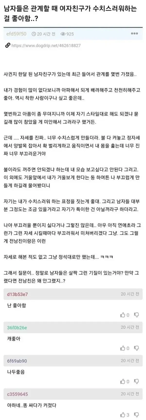 남자들은 관계할 때 여친이 수치스러워하는 걸 좋아함?