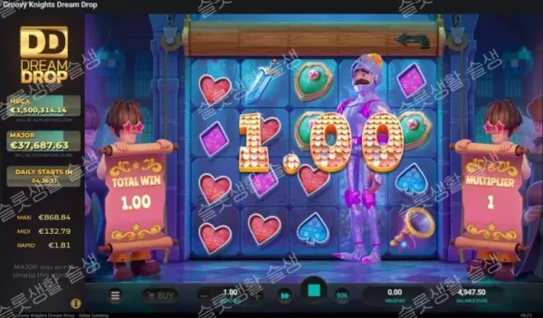 그루비 나이츠 드림 드롭은 스스로를 너무 진지하게 여기지 않는, 매우 유쾌하고 B급 감성이 넘치는 슬롯입니다. 스캐터를 모으는 지루한 과정 대신, 릴 위를 좌우로 스텝 밟으며 100배의 멀티플라이어를 뿜어내는 디스코 기사들이 베이스 게임의 긴장감을 책임집니다.