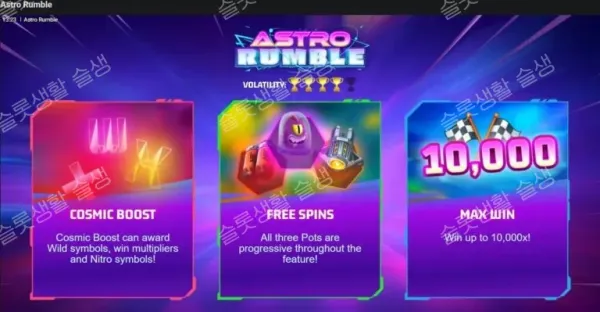 아스트로 럼블은 불샤크 게임즈가 '기호 수집과 방출' 메커니즘을 얼마나 매끄럽고 폭발적으로 다루는지 증명하는 속도감 넘치는 타이틀입니다. 지루한 일반 구간을 견디기보다는, 전략적으로 50x 코스믹 부스트 스핀을 활용하거나 자본이 넉넉할 때 300x 갤럭시 러쉬(슈퍼 프리 스핀)에 승부를 거는 하이 리스크 플레이를 강력히 권장합니다. 3개의 팟이 동시에 터질 때 쏟아지는 네온 불빛은 10,000배 승리의 신호탄이 될 것입니다.