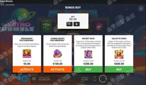 • 50x 베팅 (Cosmic Boost): 최소 2개의 팟이 확정 활성화되는 스핀