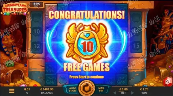 풍뎅이(Scatter) 기호 3개 이상 안착 시 프리 스핀이 시작됩니다. 보너스 라운드에서는 스캐터 기호가 화면에 떨어질 때마다 '누적 멀티플라이어'가 +1씩 영구 상승합니다. 또한, 미라 캐릭터가 무작위로 난입하여 3에서 최대 100의 멀티플라이어를 즉시 더해주는 파격적인 부스트를 제공합니다. 스핀 종료 시 쌓인 최종 배수가 총 당첨금에 곱해져 막대한 보상을 완성합니다.