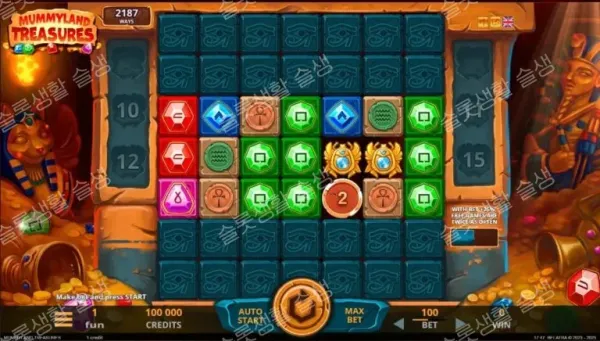 머미랜드 트레저스는 식상할 수 있는 이집트 테마를 독창적인 '블록 파괴형 공간 확장' 시스템과 생동감 넘치는 톤으로 재해석한 웰메이드 타이틀입니다. 와일드 심볼이 없다는 패널티를 파란색과 노란색의 번개 기믹으로 능연하게 극복하며 끊임없는 연쇄 텀블을 유도합니다.