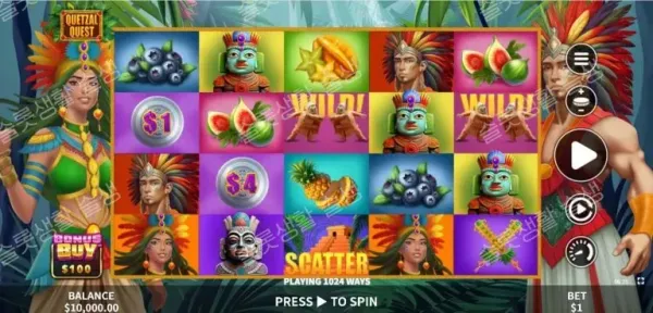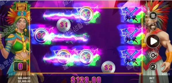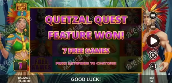 현재 베팅액의 100배를 지불하여 케찰 퀘스트 프리 스핀 7회를 즉시 시작할 수 있습니다. 단, 프리 스핀 라운드 중에는 기능 연장(Retrigger) 기호가 등장하지 않습니다.