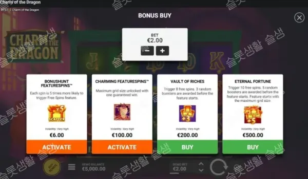 • Charming FeatureSpins (50x): 최소 1번의 당첨 보장 및 최대 릴 확장(6행) 상태로 1스핀 진행.