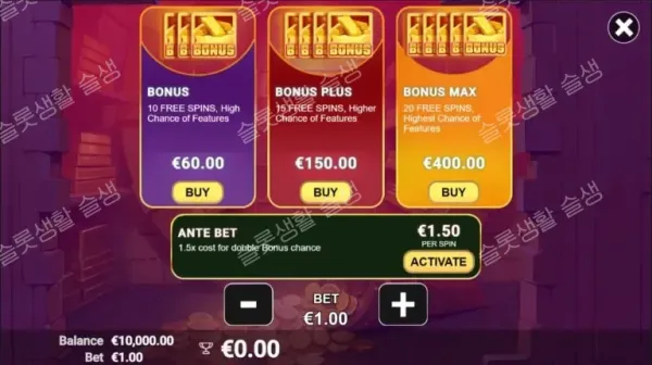 • 익스프레스(Xpress): 즉시 보너스를 구매하는 기능으로 60배(10회), 150배(15회), 400배(20회)의 세분화된 옵션을 제공합니다. 1.5배의 앤티 벳을 켜서 자연 진입 확률을 두 배로 높일 수도 있습니다.