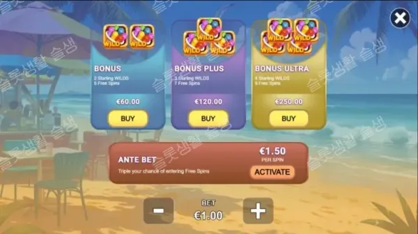 베이스 게임의 기다림을 즐기기 어렵다면, 보너스 진입 확률을 3배 올려주는 앤티 벳(1.5x)을 활성화해 두거나 밸런스가 가장 좋은 120배 보너스 구매(Bonus Plus)를 통해 아래로 흐르다 화면에 고정되는 와일드 프리 스핀의 쾌감을 직접 체험해 보시길 적극 권장합니다.