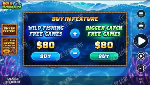• 보너스 구매(Buy In): 베팅액의 80배를 지불하면, 스핀 후 블루 스캐터(와일드 피싱) 또는 그린 스캐터(비거 캐치) 중 하나가 100% 보장되어 랜딩됩니다.